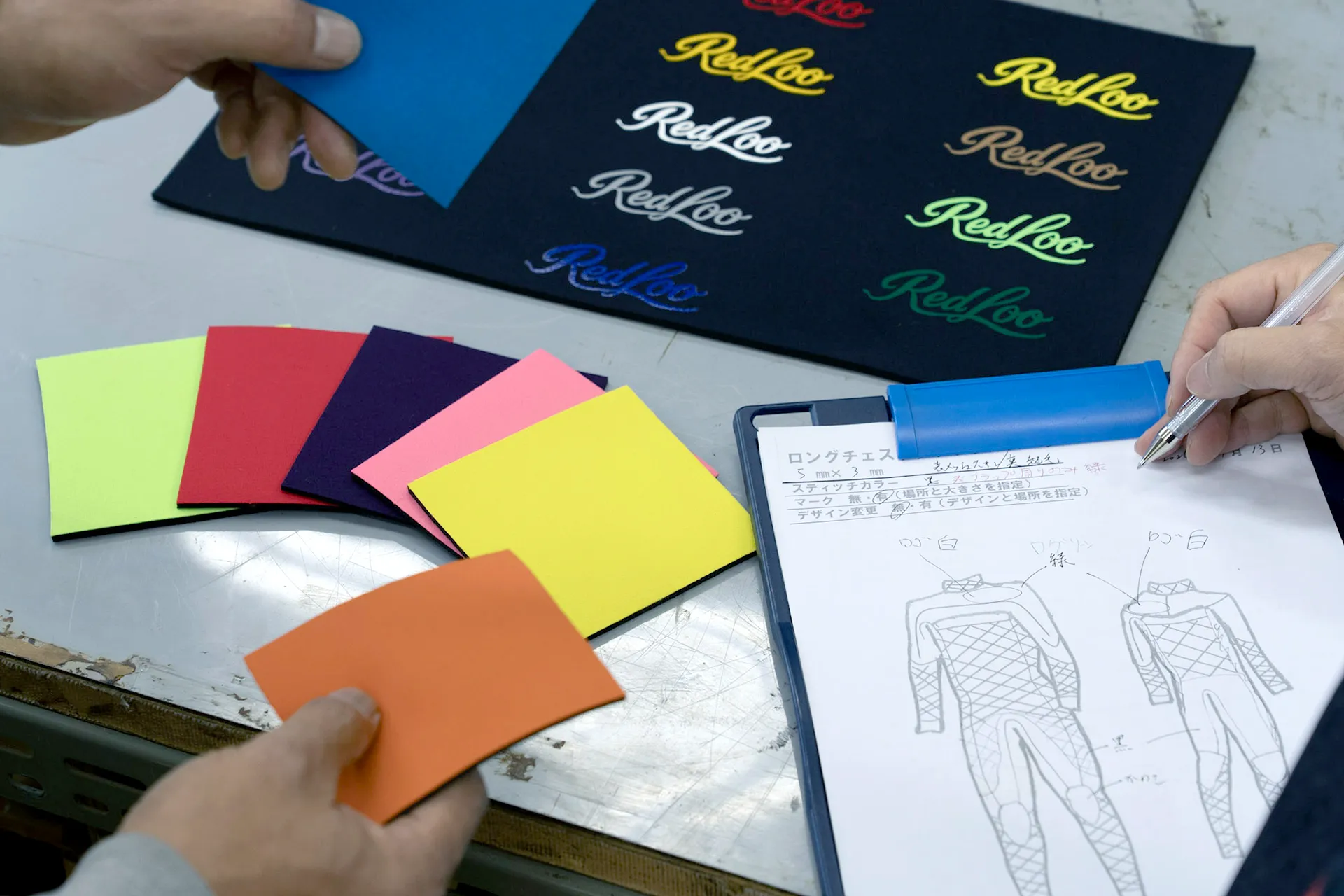素材やカラー、ロゴ位置、仕上げなど、最終的な仕様を決める段階です。 基本仕様やオプションをもとに、ご希望のスタイルをまとめていきます。 選び方に迷う場合は、スタッフまでご相談ください。