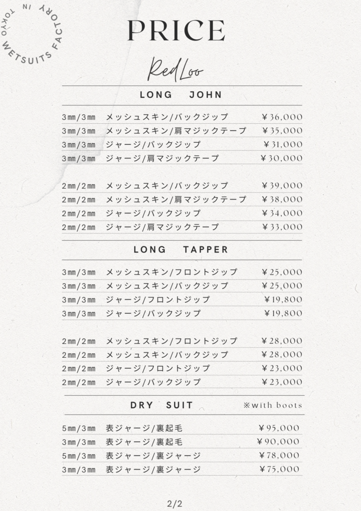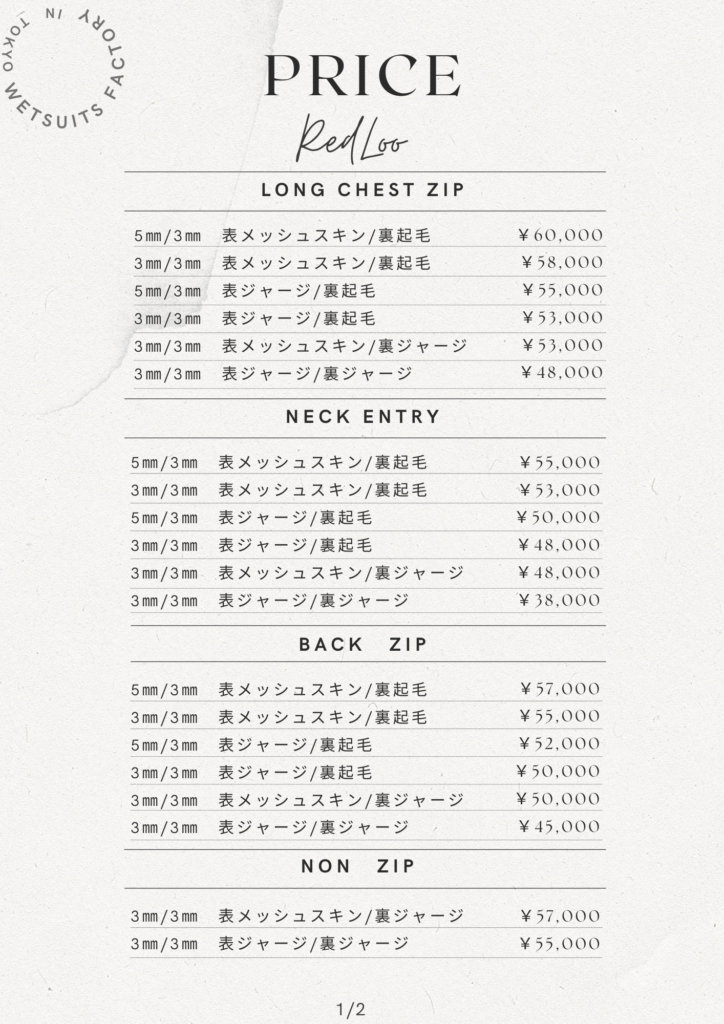 フルオーダーウェットスーツの参考価格一覧です。 生地、厚み、仕様、オプションにより価格は変動します。 最終的な金額は、ご相談内容をもとにお見積りいたします。