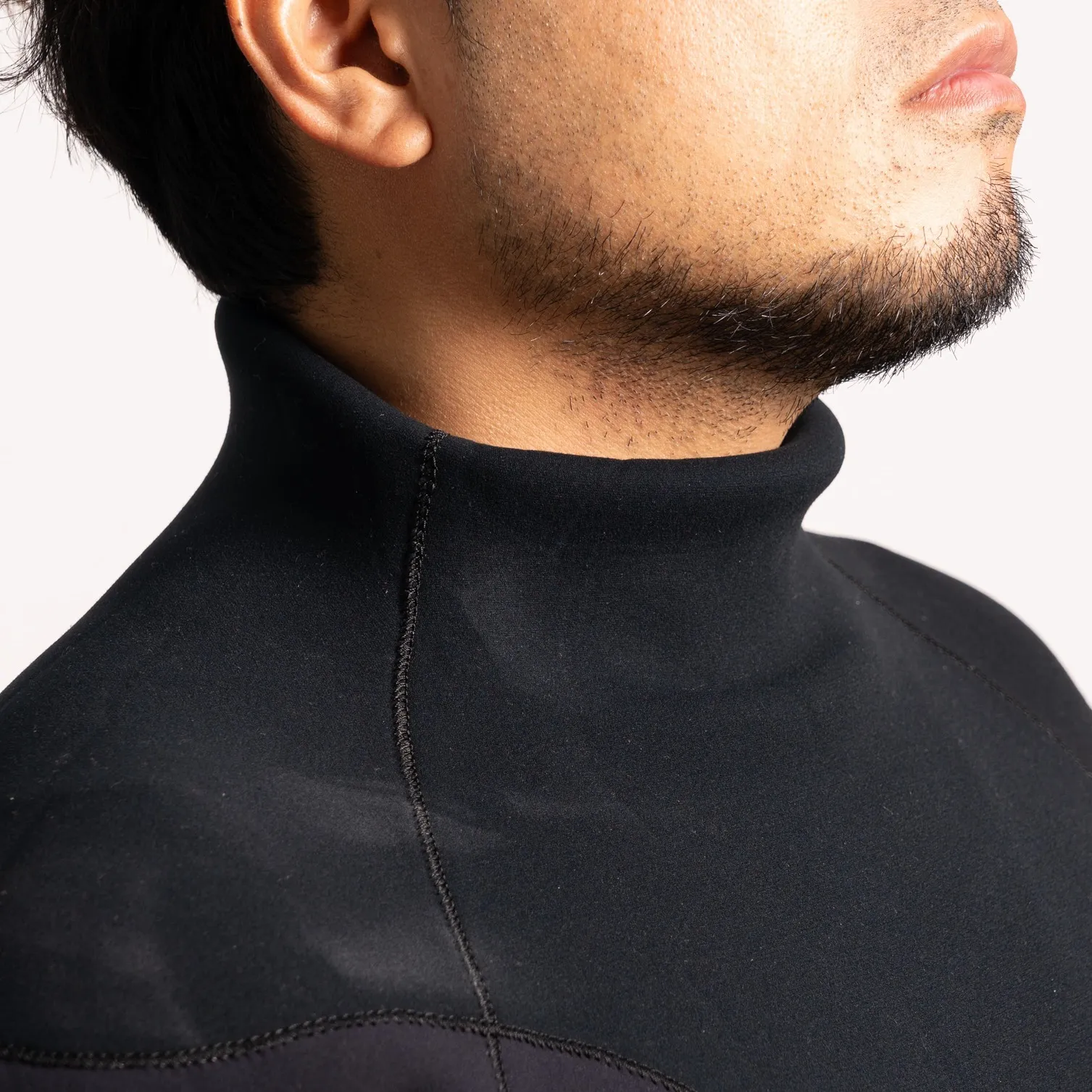 ファスナーを使わず、首元から出入りする構造。水の侵入を最小限に抑え、保温性と運動性の両立に優れています